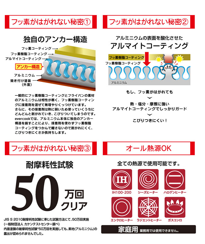 耐摩耗性試験50万回クリア!商品詳細 商品名玉子焼き 13×18cm RED evercook レッド 品番:EFPTK13RD ポイント一般的なフッ素樹脂コーティングとは一味違う! 製品への自信が、「内面フッ素のはがれに1年保証」に表れています。