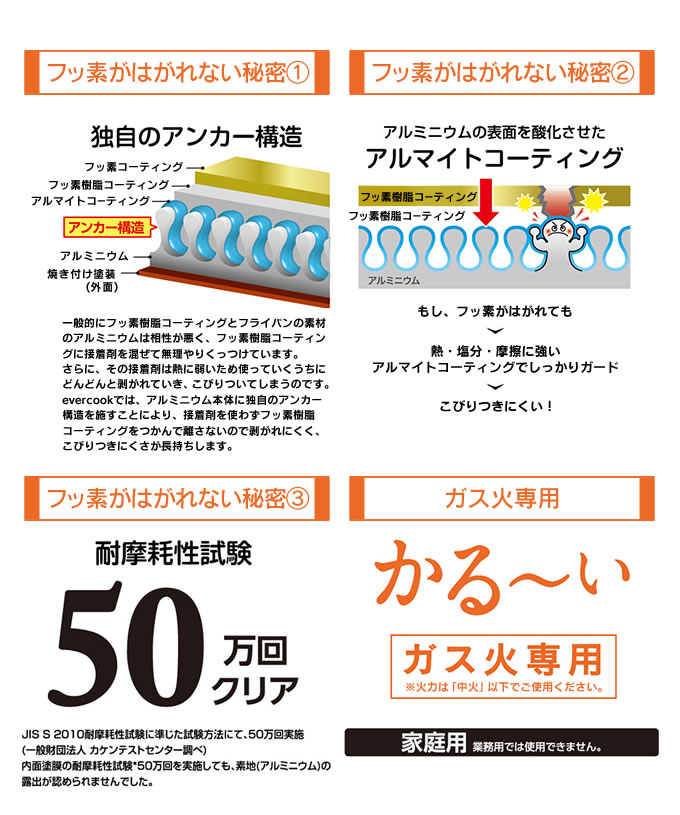 ガス火専用だから軽い! 更にフッ素樹脂のはがれに対して一年保証付き商品詳細 商品名evercook ガス専用 フライパン 20cm 品番:EFPKEK20OR ポイント内面フッ素樹脂のフライパンです。