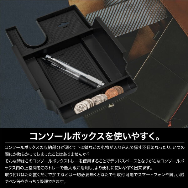 コンソールボックスにはめ込むだけの簡単取付でスマートフォン等の小物や小銭等を取り出しやすく、綺麗に収納。